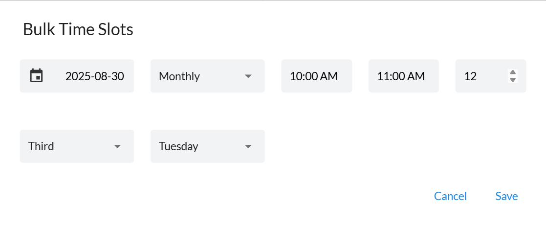 To create a recurring event, you will just need to click the 'Add Bulk Time Slots' button. From here enter the start date, select if its Weekly, Fortnightly or Monthly - If its month, you have the option to enter which day of the month it falls i.e. Third Tuesday of every month. Enter the start and end time and the number of slots you want to create i.e. 12 monthly slots or 52 weekly slots will be a years worth of events.